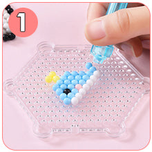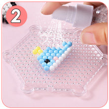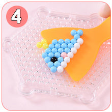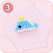 Las coloridas cuentas de manualidades se colocan sobre la plantilla, se rocían con agua y, después de secarse, se crean increíbles figuras.